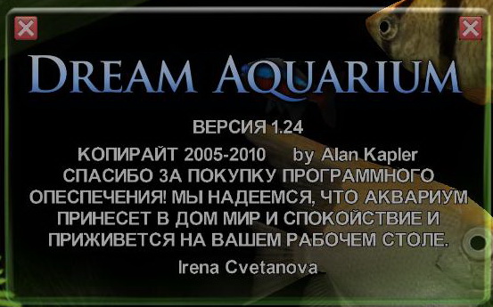 - Dream Aquarium выводит на монитор (в полноэкранном режиме) виртуальный аквариум, рыбки в котором живут каждая своей жизнью.