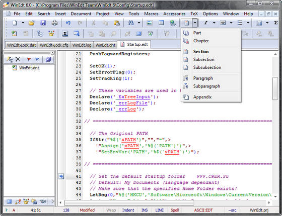WinEdt - это мощнейший ASCII-редактор с фантастическими возможностями по настройке программы. Перестраивается абсолютно все: меню, панели, кнопки... Имеются модули поддержки редактирования кодов: TeX, C++, Perl, HTML.