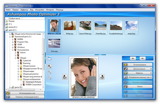 Именно поэтому Ashampoo Photo Optimizer необходим каждому, пользующемуся цифровой камерой. Программа открывает фотографии и показывает их в своем окне. Одного щелчка мышью достаточно для полной оптимизации снимка. И эффект от этой оптимизации вас впечатлит. С помощью Ashampoo Photo Optimizer снимки становятся ярче, светлее, приобретают четкость и контрастность. Если сравнивать показатели до и после преображения, заметно, насколько силен программный алгоритм оптимизации. Если ваши снимки неправильно расположены или перевернуты, вы легко повернете их всего одним щелчком мыши.