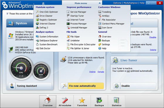 Ashampoo WinOptimizer - новая восьмая линейка пакета программ, позволяющего оптимизировать операционную систему за счет ее настройки и очистки. Включает в себя утилиты для очистки жесткого диска и системного реестра, модуль для обеспечения защиты личной информации путем поиска и удаления файлов и данных, оставшихся после интернет-cepфингa, утилиту для оптимизации интернет-соединения, модуль для настройки программ, автозагружаемых одновременно с запуском системы, а также модули для поиска и удаления ненужных фaйлoв DLL, для безвозвратного удаления данных и для шифрования файлов.