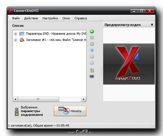 ConvertXtoDVD - программа предназначена для преобразования видео в формат, совместимый с DVD Video, и последующей записи содержимого на DVD. Программа поддерживает видеофайлы Mpeg, Mpeg, Mpeg4, MP4, VOB, WMV, DV, AVI, а также потоковое видео. Для работы программы не нужны внешние AVI-кодеки, поскольку она использует собственные. ConvertXtoDVD может автоматически создавать фрагменты (chapters), поддерживает наличие нескольких аудиодорожек, работает с субтитрами (.SRT .SUB/IDX .SSA). Также программа поддерживает создание несложного меню для DVD, в котором можно установить фон, выбрать цвет и другие параметры шрифта для надписей.