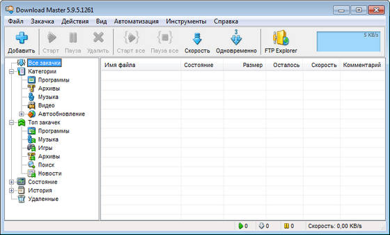 Download Master эффективно решает 3 главных проблемы возникающих при закачке файлов из Интернет: скорость закачки, продолжение прерванных закачек и управление закачанными файлами. Основными чертами, выделяющими Download Master среди других программ, являются высочайшая эффективность работы и удобный пользовательский интерфейс.