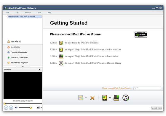 Xilisoft iPad Magic - это удобное ПО для копирования медиафайлов между iPad и компьютером, переносом iPad в iTunes и конвертации CD/DVD/видео/аудио/изображений ISO/папки IFO в форматы, поддерживаемые iPad. Xilisoft iPad Magic это всё, что вам нужно для эффективного управления вашими фильмами, музыкой и фотографиями iPad. Программа поддерживает все модели iPad, включая iPad Wi-Fi, iPad Wi-Fi+3G, iPad 16GB, iPad 32GB, iPad 64GB, и даже другие продукты Apple, такие, как iPod Touch, iPhone, iPhone 3G, iPhone 3GS.