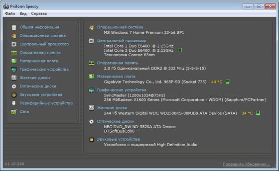 Speccy - это небольшая утилита от разработчиков популярнейшего приложения для очистки компьютера от системного мусора CCleaner. При запуске Speccy мониторит аппаратную часть компьютера, и отображает информацию об операционной системе и характеристики установленного железа. С помощью программы пользователь сможет узнать версию операционной системы, подробную информацию о процессоре, операционной памяти, винчестере, материнской плате, видео карте и др. Кроме того, отображаются температурные показатели процессора и видеокарты, а также рабочая частота RAM и скорость шины процессора.