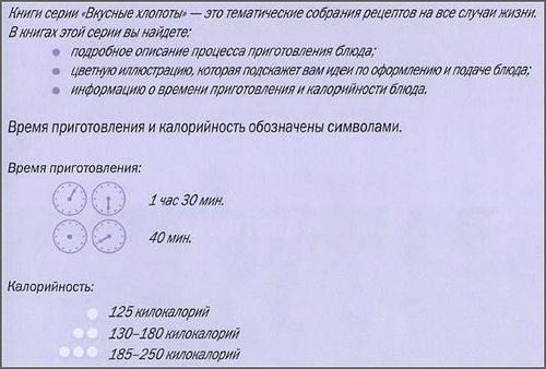 С книгами серии "Вкусные хлопоты" вы приготовите что-нибудь очень вкусное без особых хлопот! В книгах этой серии вы найдете: подробное описание процесса приготовления блюда, цветную иллюстрацию, которая подскажет вам идеи по оформлению, информацию о времени приготовления и калорийности блюда.