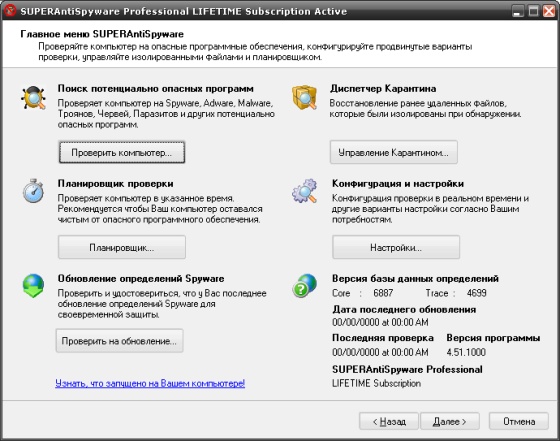 SUPERAntiSpyware сканирует память, реестр и файлы на предмет заражения шпионскими модулями. Средствами программы найденных паразитов можно удалить или поместить в карантин. Предусмотрена возможность сканирования тремя способами: при быстром сканировании проверяются только самые распространенные места заражения, при полном - все файлы, а в третьем режиме можно самостоятельно выбрать область проверки. Встроенный планировщик поможет организовать проверку компьютера в заданное время. Кроме этого программа умеет защитить от изменений стартовую страницу браузера, восстановить настройки Интернет-соединений, Рабочего стола, уровня безопасности Internet Explorer и многих других параметров. Чтобы эффективно бороться со шпионскими модулями и вредоносными программами, утилита автоматически обновляет свою базу данных через Интернет.