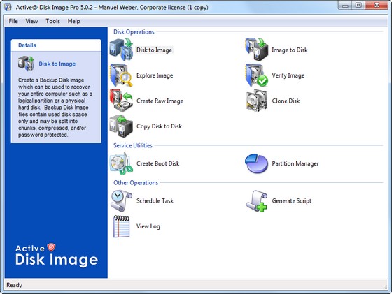 Программа Active@ Disk Image предназначена для создания и копирования образов жестких дисков. Это может быть полезно при копировании данных с компьютера на компьютер, а также в целях резервного копирования данных. Программа работает в чистом DOSe, то есть с загрузочной дискеты. Образ резервирования может быть сохранен на USB накопителе, сетевом хранилище, записан напрямую на CD/DVD/BR диски, или сохранено на других медиа носителях. Решение по резервированию данных для компьютера или любых компьютерных дисков, включая операционную систему, приложения и пользовательские файлы. В случае краха компьютера, резервный образ может использоваться для восстановления компьютерной системы или для поиска и восстановления любого нужного файла из образа.