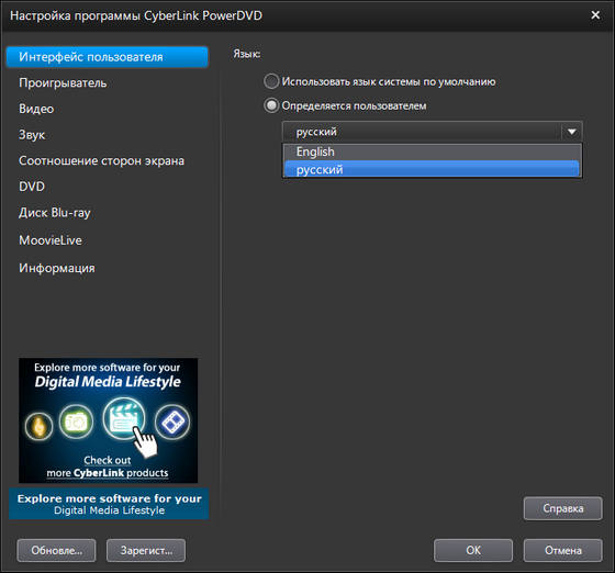 CyberLink PowerDVD - один из самых лучших современных программных проигрывателей, позволяющий осуществлять интерактивный просмотр дисков DVD-Video и Video CD на вашем компьютере. К основным достоинствам данного проигрывателя можно отнести высокое качество изображения, удобный интерфейс со скинами и хорошую настраиваемость. Кроме просмотра фильмов с компакт-дисков (DVD и Video CD), PowerDVD позволяет проигрывать файлы форматов, поддерживаемых Windows Media Player, а также MPEG1 и MPEG2. В программе также имеются функции захвата кадров в файл формата BMP, повтора участка записи, регулировки параметров отображения, запоминания момента остановки, поддержки колеса прокрутки мыши и многие другие возможности. С помощью функции Movie Collection вы можете создавать собственный каталог вашей коллекции фильмов, храня рецензии, личные примечания, информацию об обложке фильма, а также обмениваться этими данными с другими пользователями с помощью сервиса MoovieLive.