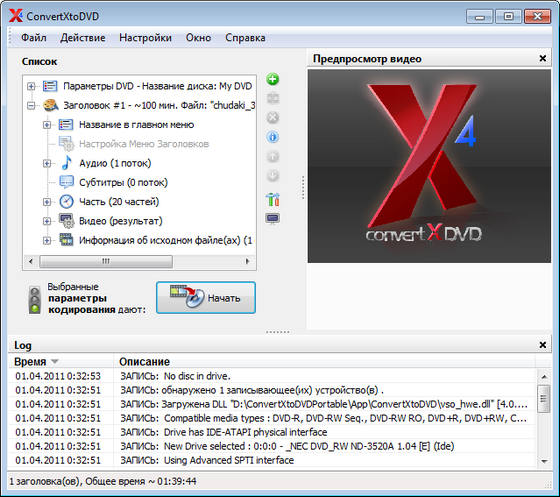 ConvertXtoDVD - программа предназначена для преобразования видео в формат, совместимый с DVD Video, и последующей записи содержимого на DVD. Программа поддерживает видеофайлы Mpeg, Mpeg4, MP4, VOB, WMV, DV, AVI, а также потоковое видео. Для работы программы не нужны внешние AVI-кодеки, поскольку она использует собственные. ConvertXtoDVD может автоматически создавать фрагменты (chapters), поддерживает наличие нескольких аудиодорожек, работает с субтитрами (.SRT .SUB/IDX .SSA). Также программа поддерживает создание несложного меню для DVD, в котором можно установить фон, выбрать цвет и другие параметры шрифта для надписей.