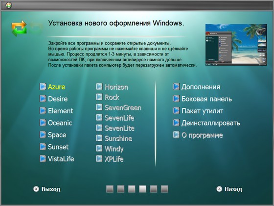 XPLife - программа предназначена для изменения интерфейса Windows XP x86 (32-bit), делая его похожим на Vista и Seven. Отличительной чертой XPLife является стабильная работа и поддержка двух собственных точек восстановления системы. При трансформации системы, изменяется огромное количество иконок, картинок, добавляются новые функции, звуки, курсоры, обновляются до 500 системных файлов, всего около 4000 ресурсов. Интерфейс Windows выдержан в нескольких тонах, четырнадцать стилей оформления и четырнадцать тем, выбор удовлетворит даже самых требовательных пользователей. Программа изменяет только визуальную часть файлов Windows не затрагивая программный код, поэтому безопасна в использовании и не потребляет дополнительные ресурсы, используются только системные. Программа имеет русский интерфейс.