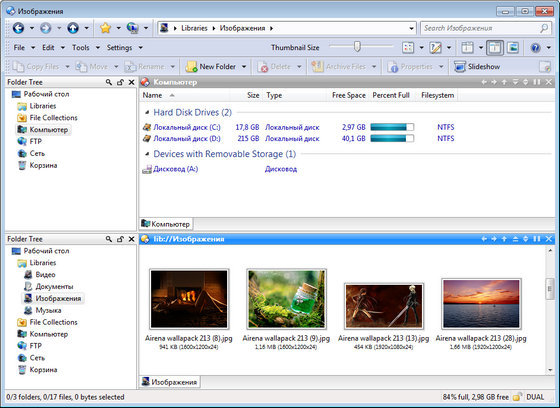 Directory Opus - 10-ая версия мощной альтернативы Проводнику с настраиваемым интерфейсом, встроенным ftp-клиентом, внутренней поддержкой архивов, просмотром изображений, встроенным командным языком, настраиваемыми горячими клавишами для управления и очень большим числом других полезных при работе с файлами опций. Например, поиск дубликатов, безвозвратное удаление файлов, поддержка SSL и SSH/SFTP, конвертирование графики и т.д.