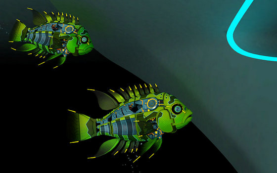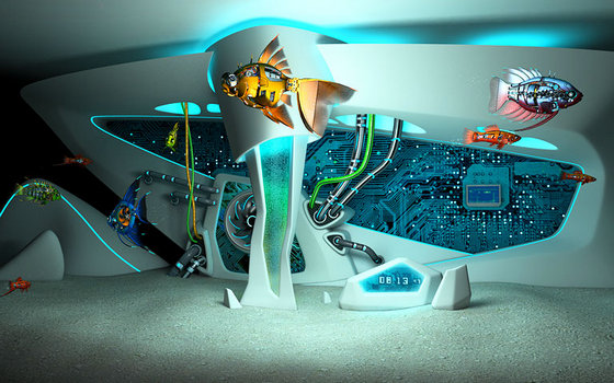 Превратите свой экран в трёхмерный аквариум в стиле sci-fi и созерцайте неторопливое плавание удивительных механических рыб среди причудливых форм будущего.