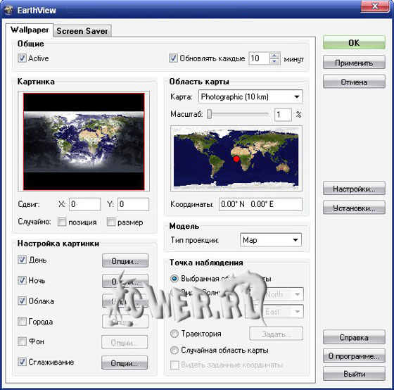 EarthView - это динамические обои и скринсейвер в виде карты нашей планеты или глобуса вращающегося синхронно с оборотом земли (поддерживает смену дня/ночи, облака, огни городов). EarthView может работать как скринсейвер, который создает высокодетализированные красивые виды земли (глобус или карта). Программу выделяют очень высокое качество изображения и насыщенные цвета. Все параметры генерации изображения гибко настраиваются, что позволяет подстроить качество изображения под производительность конкретного компьютера. С сайта разработчика можно скачать дополнительные (фотореалистичные) карты земной поверхности.