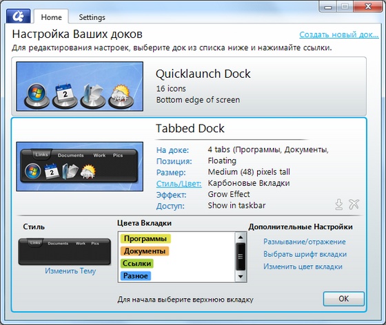 Separator’ы (вертикальные линии разделения) позволяют создать различные группы запуска. Присутствует возможность изменения шрифта и стиля написания всплывающих подсказок. Расположение панели может варьироваться в зависимости от Вашего желания: расположение сверху, слева, справа и снизу, заменяя тем самым стандартную панель управления. Возможна смена фона панели и степени ее прозрачности, а также автоматическое скрытие.