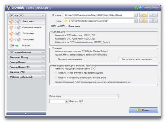 - Копировать на чистый DVD диск любого формата(DVD+R/RW, DVD-R/RW, DVD+R DL, DVD-R DL).