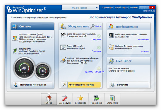 Ashampoo WinOptimizer - новая 8ая линейка пакета программ, позволяющего оптимизировать операционную систему за счет ее настройки и очистки. Включает в себя утилиты для очистки жесткого диска и системного реестра, модуль для обеспечения защиты личной информации путем поиска и удаления файлов и данных, оставшихся после интернет-cepфингa, утилиту для оптимизации интернет-соединения, модуль для настройки программ, автозагружаемых одновременно с запуском системы, а также модули для поиска и удаления ненужных файлов DLL, для безвозвратного удаления данных и для шифрования файлов. Кроме этого, программа позволяет переназначать ассоциации файлов, шифровать и расшифровывать файлы, а также безвозвратно их удалять. Наконец, возможна настройка параметров системы и ее оптимизация за один клик.