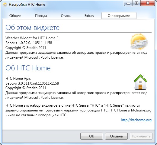 HTC Home Extras – это различные дополнения, которые расширяют функциональность виджетов. Это могут быть провайдеры погоды, ресурсы и т.д. Для установки дополнений, просто перетащите их на исполняемый файл любого виджета (Clock.exe, Weather.exe). Удалить их вы можете в настройках, на вкладке Extras.