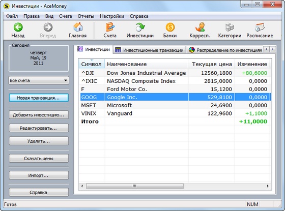 AceMoney помогает просто и эффективно управлять расходом личных денежных средств. Мы разрабатывали AceMoney для тех, кто не имеет ни малейшего понятия о бухгалтерии. Несмотря на свою простоту, программа обладает всеми качествами больших финансовых пакетов. Ваши расходы и доходы учитываются в нескольких валютах. Программа поддерживает более 150 валют и автоматически скачивает их курсы обмена из интернета. AceMoney позволяет с легкостью следить за текущим состоянием ваших акций и фондов. К тому же, программа позволяет скачивать текущую стоимость акций с российских и международных бирж.