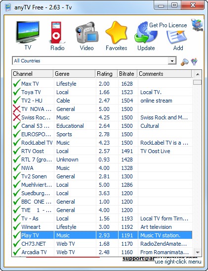 АnyTV - быстрая и удобная программа для просмотра более 2800 TV каналов из России и зарубежья, а так же прослушивания 5000 радио-станций со всех уголков нашей планеты. Все каналы можно сортировать по жанру, стране, битрейту или краткому описанию. Понравившийся канал можно занести в список избранного для быстрого доступа в дальнейшем. Установив AnyTV вы получите доступ к новостям, развлекательным передачам, каналам для взрослых, документальным фильмам, музыке, спорту, мультфильмам, каналам культуры и религии, а также к "живым" камерам со всего мира.