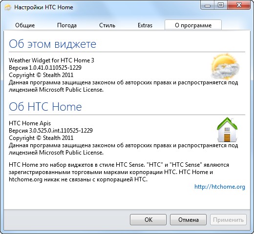 HTC Home Extras – это различные дополнения, которые расширяют функциональность виджетов. Это могут быть провайдеры погоды, ресурсы и т.д. Для установки дополнений, просто перетащите их на исполняемый файл любого виджета (Clock.exe, Weather.exe). Удалить их вы можете в настройках, на вкладке Extras.