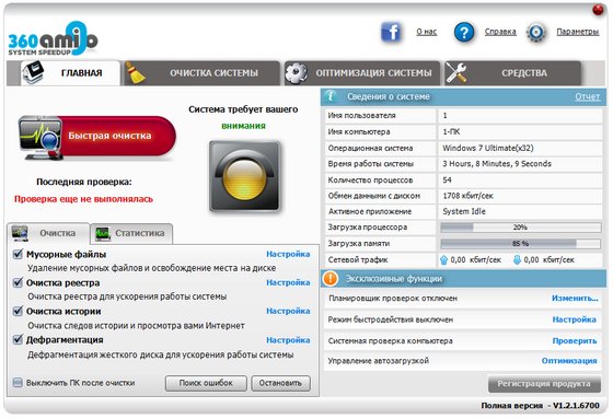 Думаете, что Ваш ПК слишком медленный? 360Amigo System Speedup может быстро вычислить и исправить широкий спектр ошибок и ускорит работу Вашего медленного ПК. 360Amigo System Speedup определяет и удаляет на Вашем компьютере все неиспользуемые файлы, оставшиеся от неправильной установки / удаления программ, он оптимизирует Ваш Windows, тем самым ускоряя время запуска системы. Кроме того, эта программа препятствует запуску вредоносных процессов на Вашем ПК. Также, она удаляет следы Вашей он-лайн активности, а именно историю просмотра, cookie-файлы, временные файлы, журнал регистраций, неверные ссылки и многое другое. Но самое главное в этой программе это то, что она мало весит, невероятно быстра и действенна (обычно её прогон занимает менее минуты). 360Amigo System Speedup выжмет максимум из Вашего ПК и сделает его снова как новым. Доступными функциями и возможностями этой программы смогут наслаждаться как новички, так и опытные пользователи.