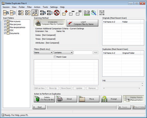 Delete Duplicate Files - мощный высокоскоростной инструмент для удаления одинаковых файлов с компьютера. Имеет разнообразие дополнительных критериев сравнения и фильтров, включая правило определения самого оригинального файла. Предлагает три варианта действий по выявленным дубликатам: удаление, полное удаление и перемещение. Присутствует интуитивно понятный интерфейс и возможность вывода для просмотра статистики и ведение логов работы.