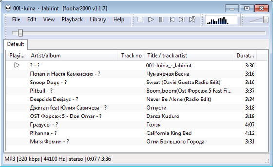 foobar2000 - аудиоплеер, основные черты которого качественный звук, широкие возможности настройки, спартанский интерфейс и низкие системные требования. Foobar проигрывает файлы форматов MP1, MP2, MP3, MP4, MPC, AAC, Ogg Vorbis, FLAC / Ogg FLAC, WavPack, WAV, AIFF, AU, SND, CDDA, WMA (lheubt форматы могут поддерживаться при установке соответствующих плагинов). Имеется полная поддержка unicode. В программе использован новый формат плейлистов (m3u8) и поддерживается чтение APEv2-тэгов из файлов MP3 (id3v2 не поддерживается).