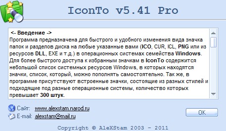IconTo - программа предназначена для быстрого и удобного изменения вида значка папок и разделов диска на любые указанные вами (ICO, CUR, ICL или из ресурсов DLL, EXE и т.д.) в операционных системах семейства Windows. Для более быстрого доступа к избранным значкам в IconTo содержится небольшой список системных ресурсов Windows, в которых находятся значки, список, который, можно пополнять самостоятельно. Так же, в программе присутствуют встроенные значки, состоящие из разных стилей и подходящие под разные операционные системы, количество которых превышает 300 штук.
