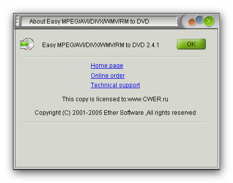 Скачать программу Easy MPEG/AVI/DIVX/WMV/RM to DVD 2.4.1 (7,66 МБ):