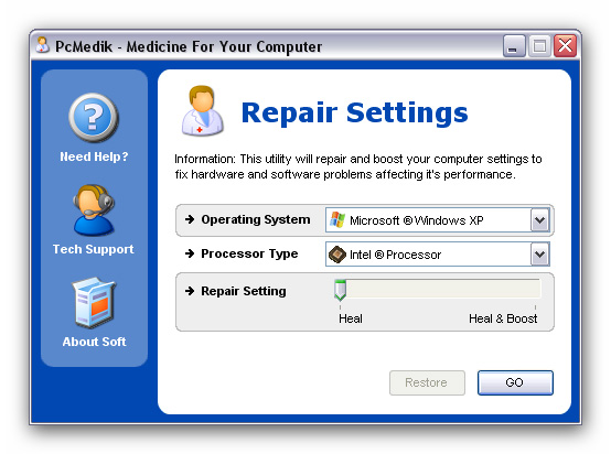 PCMedik - это небольшая программа, предназначенная для настройки параметров и оптимизации работы операционных систем Windows, позволяет уменьшить количество зависаний, "падений" и т.д. Вся работа с программой осуществляется посредством простого интерфейса. Требуется лишь указать операционную систему (Windows XP, например), производителя процессора (Intel, AMD, другой) и выбрать, что необходимо сделать: "вылечить" или "вылечить и оптимизировать". После применения PCMedik может заметно возрасти скорость работы приложений в среде Windows.