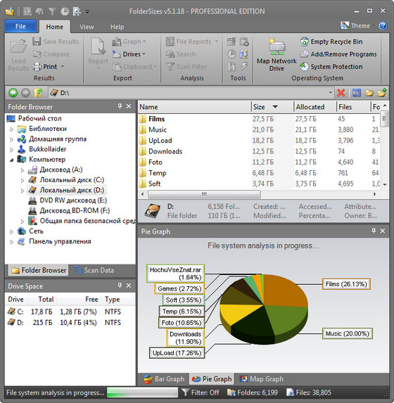Эта программа позволит вам провести проверку жестких дисков на наличие на них свободного места. Если вы никак не можете понять, почему места осталось так мало, запустите FolderSizes Pro, и программа создаст для вас полный отчет. Программа сгенерирует диаграммы, которые наглядно покажет, какие папки занимают больше всего места. Среди возможностей программы: Распечатка отчетов, экспорт их в HTML; Экспорт диаграмм в файлы JPEG, PNG, BMP или TIFF; Система создания отчетов по типам файлов, которые занимают больше всего места.