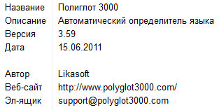Полиглот 3000 (или сокращённо П3000) – это автоматический определитель языка, который предназначен для быстрого и корректного определения того на каком языке написан введённый Вами текст. Программа работает в операционных системах Windows 95/98/NT/ME/2000/XP/Vista/7.