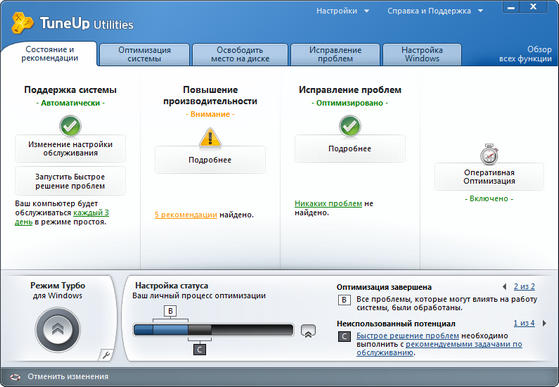 TuneUp Utilities предлагают Вам два новых метода оптимизации, которые гарантируют оптимальную работоспособность даже при высокой загруженности компьютера. В случае необходимости, быстродействие будет увеличено или ускорится процесс запуска программы.