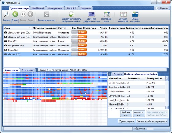 Данные в этой таблице отображаются в виде разноцветных квадратиков, расшифровку цвета которых можно посмотреть в главном окне PerfectDisk. Стоит отметить довольно быструю работу утилиты. Это связано с тем, что используется однопроходный метод дефрагментации с учётом S.M.A.R.T. данных винчестера. Может дефрагментировать не только локальные диски, но и с сетевые, причем в этом случае для облегчения настройки заданий используются профили сетевого планирования дефрагментации и полностью настраиваемое протоколирование работы. Поддерживаются работа с RAID-томами.
