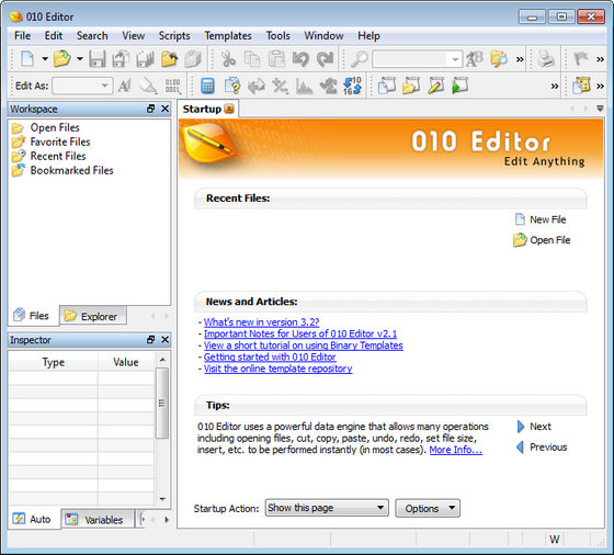 010 Editor – это профессиональный HEX-редактор, разработанный для редактирования любого бинарного файла, устройства или процесса на вашем компьютере. Используя уникальную технологию Бинарных Шаблонов, 010 Editor позволяет проанализировать бинарный файл. К характеристикам редактора относится простота в использовании со стандартным набором опций, таких как: вырезать, копировать и вставить, поддержка больших файлов и неограниченные уровни отмены и отмены последней операции для всех операций редактирования. В набор сервисных программ редактирования и анализа включены: поиск , перемещение, сравнение бинарных файлов, гистограммы, проверка суммы, ASCII/EBCDIC/UNICODE преобразования, поиск в файле, импорт , экспорт, подчеркивание, пометки и печать. Имеется онлайн хранилище шаблонов и сценариев, которые доступны для скачивания.