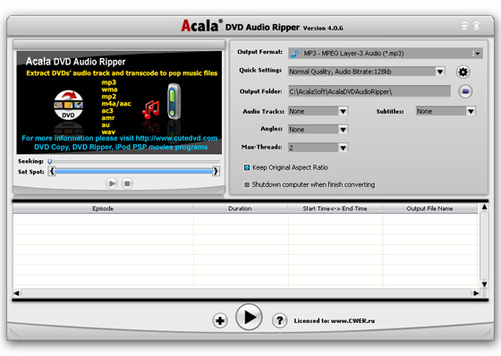 Расширенный встроенный кодер сжимает эффективно и выводит файл не только в минимальном размере, но и с лучшим качеством. С Acala DVD Audio Ripper вы можете делать рип DVD аудиотреков и конвертировать их в различные аудиоформаты.