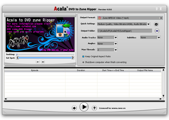 Скачать программу Acala DVD Zune Ripper 4.0.6 (11,43 МБ):
