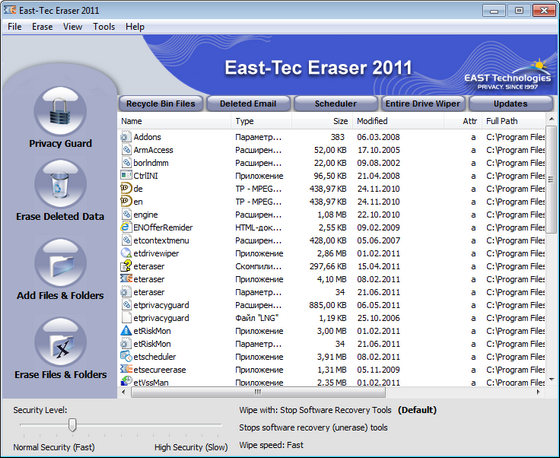 East-Tec Eraser 2011 - мощная программа для очистки Вашей системы от мусора и следов пребывания в интернете без возможности восстановления! Комплексное уничтожение таких данных как: история IE, история открываемых документов, cookies, переговоров в чатах, темп файлов IE и системы, свопа, кусков от Офиса, личные файлы, файлы по маске и т.д.
