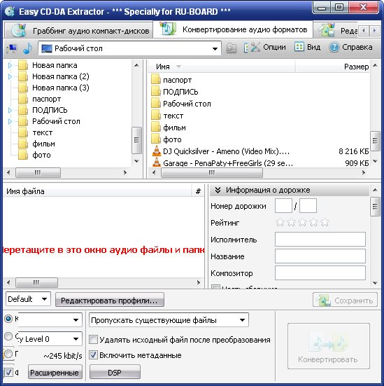 Easy CD-DA Extractor - программа для преобразования аудио-CD в качественные цифровые аудиофайлы, а также для записи MP3, WAV MP4, Windows Media Audio, FLAC, Ogg Vorbis, AAC и Monkey-s файлов на аудио-CD. Допускается преобразование аудиотреков непосредственно в MP3, WMA, VQF, OGG или WAV и конвертирование из одного аудиоформата в другой.