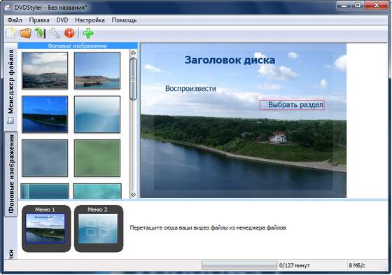 - импорт графических файлов для заднего фона DVD меню