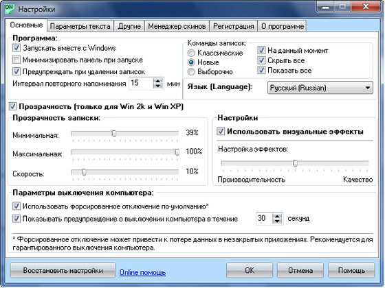 - Настройка параметров заметок (их размера, текста, фона и цвета заголовка, положение на рабочем столе, прозрачность, ярлыки);