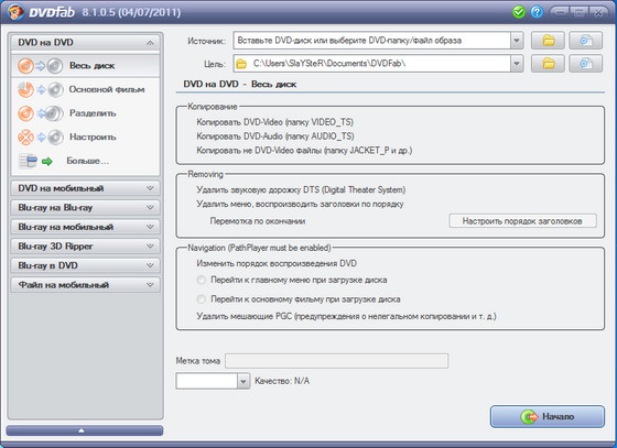 DVDFab – мощный, многофункциональный программный продукт для копирования DVD дисков с возможностями гибкой обработки видеопотока. Программа является одной из лучших на сегодняшний день, из инструментов для копирования, разбиения, пережатия и конвертирования DVD дисков с фильмами. Снимает все защиты и ограничения с диска и при желании пережмет диск большой емкости и вместит его в обыкновенную пустую DVD болванку с минимальными потерями качества (DVD9->DVD5) или разобьет фильм на два диска с полным переносом его меню, удалит всю рекламу, запишет только фильм и многое другое. Программа имеет интуитивно понятный, мультиязычный интерфейс включая русский.
