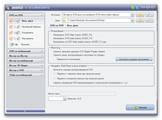 - 8 режимов копирования DVD на DVD:полный диск,основной фильм,разделение,переделывание,разделение по своему определению,клон,объединение и писать данные.