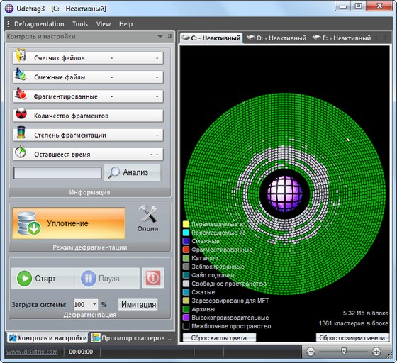 UltimateDefrag - это дефрагментатор и оптимизатор размещения файлов на жестком диске, который учитывает больше чем только фрагментацию файлов. Фрагментация файла - только незначительная часть улучшения работоспособности накопителя, другая, более важная часть - относительное размещение наиболее часто используемых файлов на вашем винчестере, а также уплотнение файлов. UltimateDefrag имеет очень высокую скорость работы и позволяет достигнуть максимальных результатов.