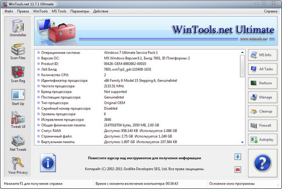 WinTools.net – набор инструментов для оптимизации операционной системы Windows. В состав программы входят компоненты для полного удаления нежелательных программ и «мертвых» ссылок реестра, а также для контроля процессов, настройки системы, интернет-соединений и интерфейса. Кроме того, имеются утилиты для надежного хранения конфиденциальной информации.