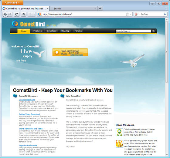CometBird – шустрый браузер, построенный с использованием свободного портируемого движка Gecko, который также использовался при создании всемирно известного и популярного обозревателя Firefox. CometBird практически не отличим по интерфейсу от своего более раскрученного собрата, обладает возможностью расширения за счет плагинов и модулей, но в то же время имеет ряд характерных особенностей, как например возможность загрузки онлайнового аудио и видео, автосинхронизация закладок и наличие средств для проверки новых версий установленного на компьютере ПО и его быстрой загрузки.