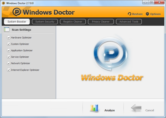 Windows Doctor - профессиональная программа для защиты и оптимизации операционной системы Windows. Оптимизирует, сканирует, анализирует и устанавливает необходимые "заплатки" в вашу систему. Программа быстро ищет и очищает ненужные записи в системном реестре и поддерживает его в оптимальном состоянии. Убирает следы Вашего пребывания в интернете и использования программного обеспечения. Функция System Speed-Up анализирует информацию от центрального процессора, оперативной памяти и драйверов и разумно обеспечивает оптимизацию системы! Для того, чтобы компьютер работал быстро и без ошибок систему нужно поддерживать в здоровом состоянии.