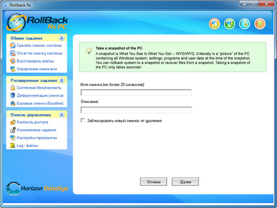 • Создание новых снимков вручную, автоматически или при исполнении файла.