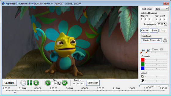 Программа имеет навигационные средства управления, схожие с управлением видеомагнитофона, позволяющие вам быстро делать обзор видео файла в прямом или обратном направлении, перейти к любому кадру, захватить копию экрана и сохранить выходной файл на жесткий диск. Кроме того программа имеет встроенный редактор для создания GIF анимации. Данный редактор предлагает вам много стилистических опций, для создания мультипликации, позволяет настраивать множество параметров анимации: размер экрана, цвет фона, время задержки, смещение и т.д.