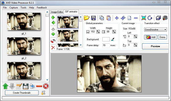 AVD Video Processor - является легким в использовании инструментом для захвата кадров из видео файлов и создания профессионально выглядящих GIF анимаций. Приложение, работает практически со всеми популярными видео и графическими форматами, доступные в настоящее время, включая AVI, MPEG, MPG, DivX, а также FAX, TIFF, GIF, JPEG, PNG, BMP, PCX, PDF, PS, WBMP , DIB, RLE, TGA, PBM, PGM и PPM, PDF, PostScript (PS, EPS), Adobe Photoshop PSD. Что позволяет обрабатывать видео без необходимости конвертировать его в подходящий формат во внешних приложениях.